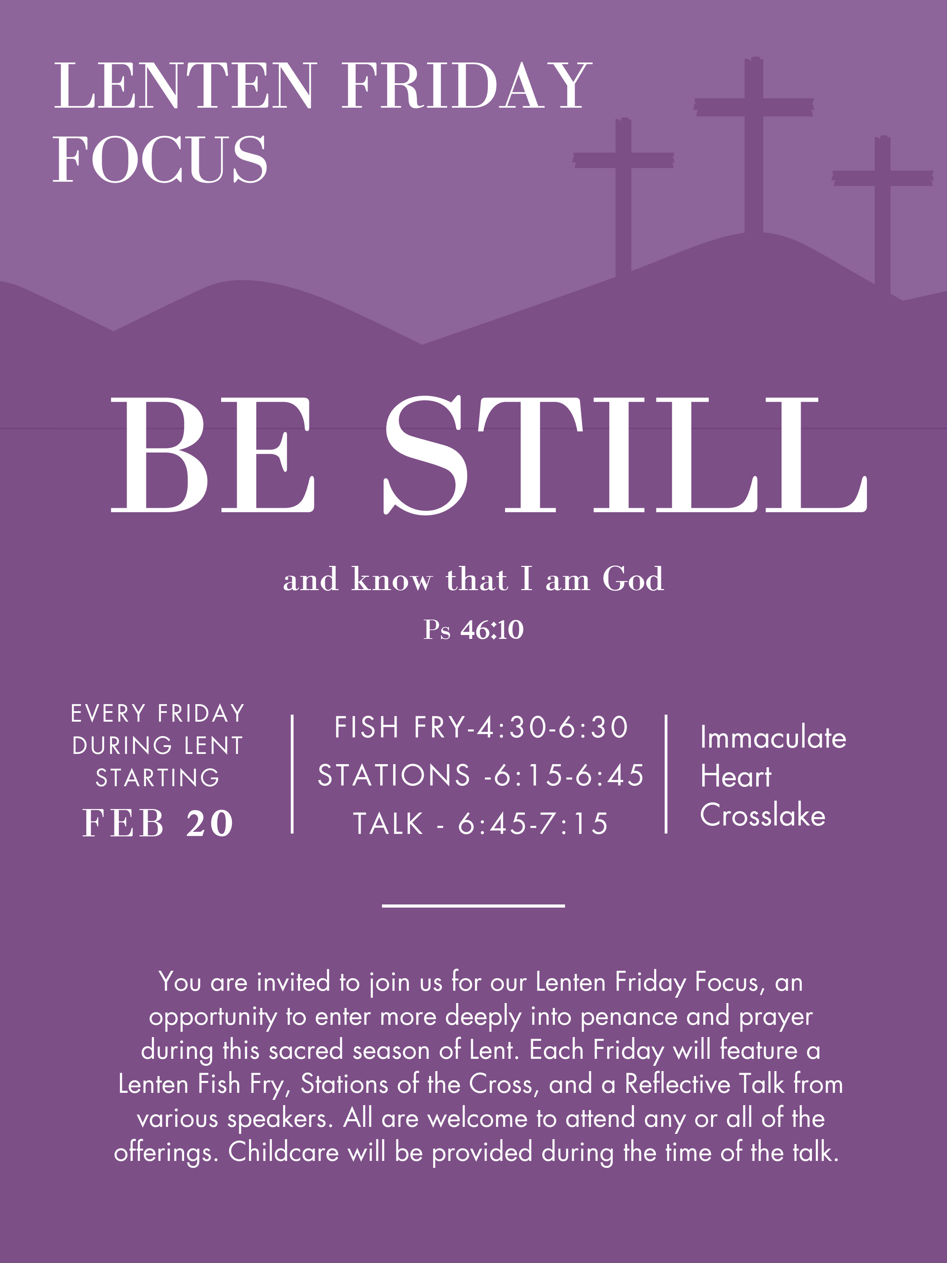 Rosary: at 8:00 am on Wednesdays; Fridays one half hour before Mass